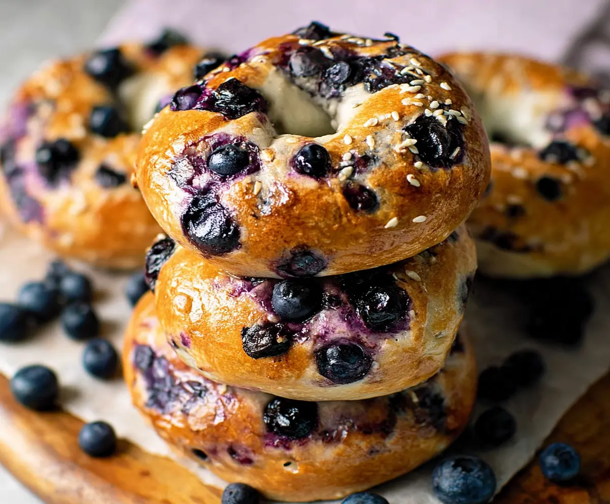 These delicious blueberry bagels are a treat for breakfast or snack time. Enjoy their soft, chewy texture and sweet blueberry flavors!