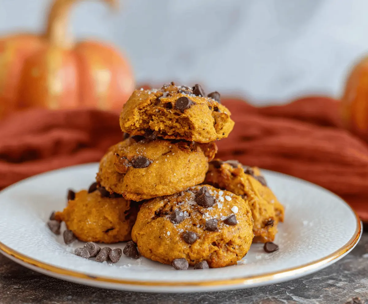 Delicious homemade air fryer pumpkin cookies topped with chocolate chips on a white plate, perfect for fall desserts.