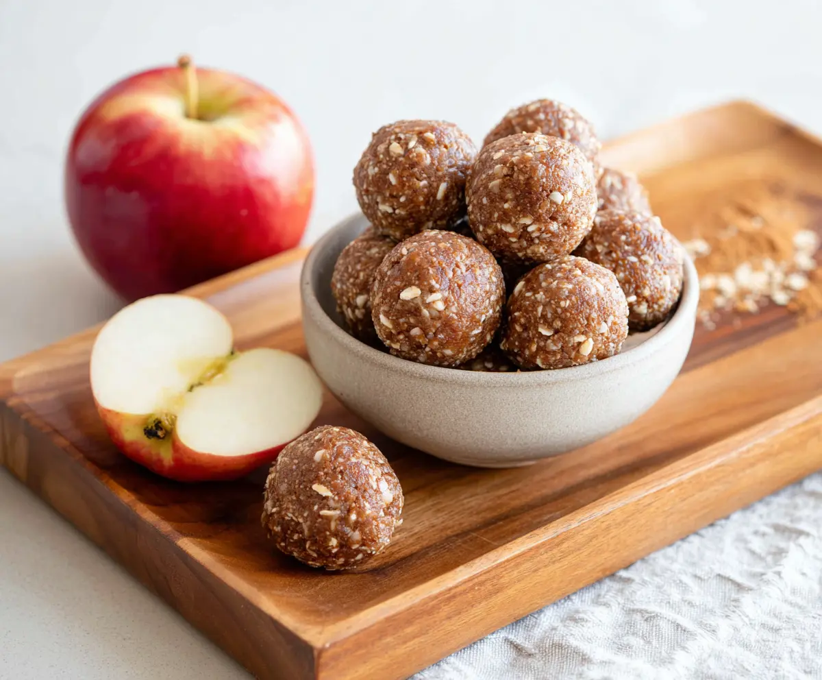 Delicious Apple Pie Protein Bites served in a clear bowl showcasing a nutritious snack with fresh apple slices.