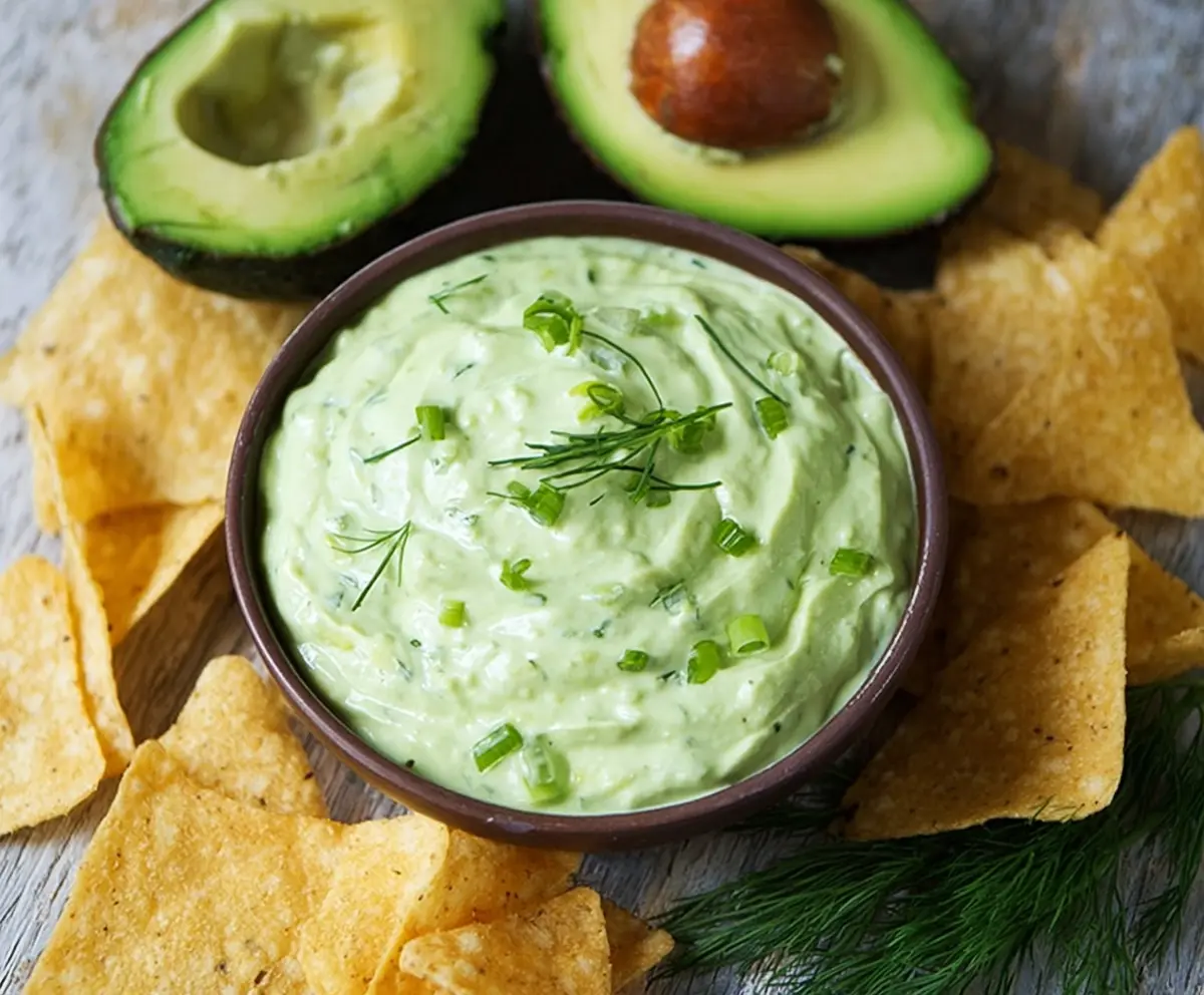 Creamy avocado ranch dip served with fresh vegetables for a healthy snack.