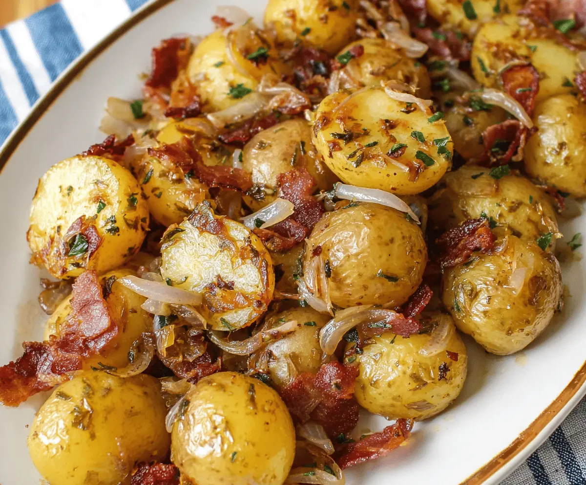 This delightful combination of tender baby potatoes, sweet onions, and crispy bacon is sure to be a hit at your dinner table. Perfect for complementing roasted meats or even on its own as a hearty side. Enjoy!