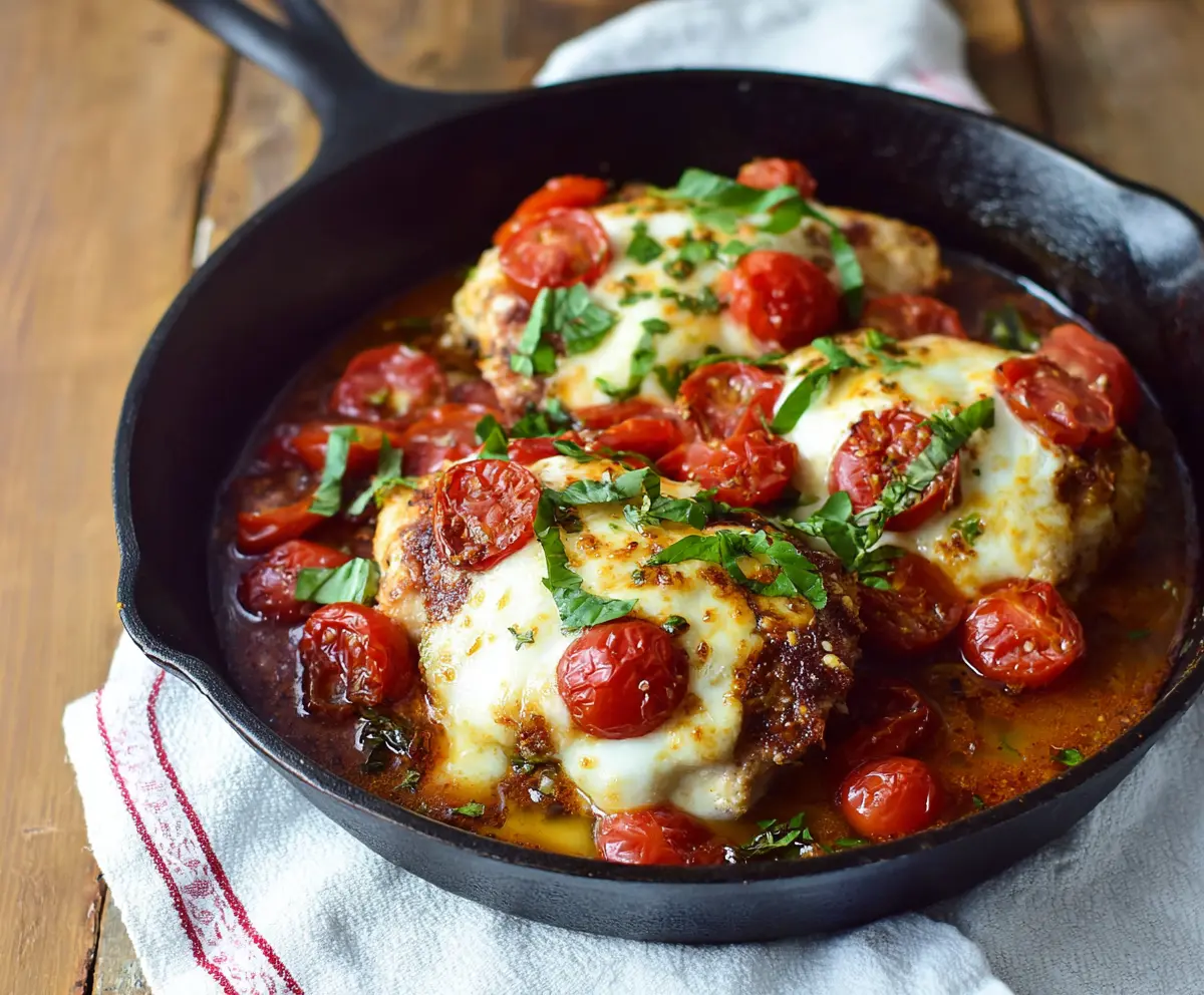 This recipe showcases juicy baked chicken breasts topped with melted mozzarella, roasted cherry tomatoes, and fresh basil, capturing the essence of the famous Caprese salad in a warm, comforting dish.