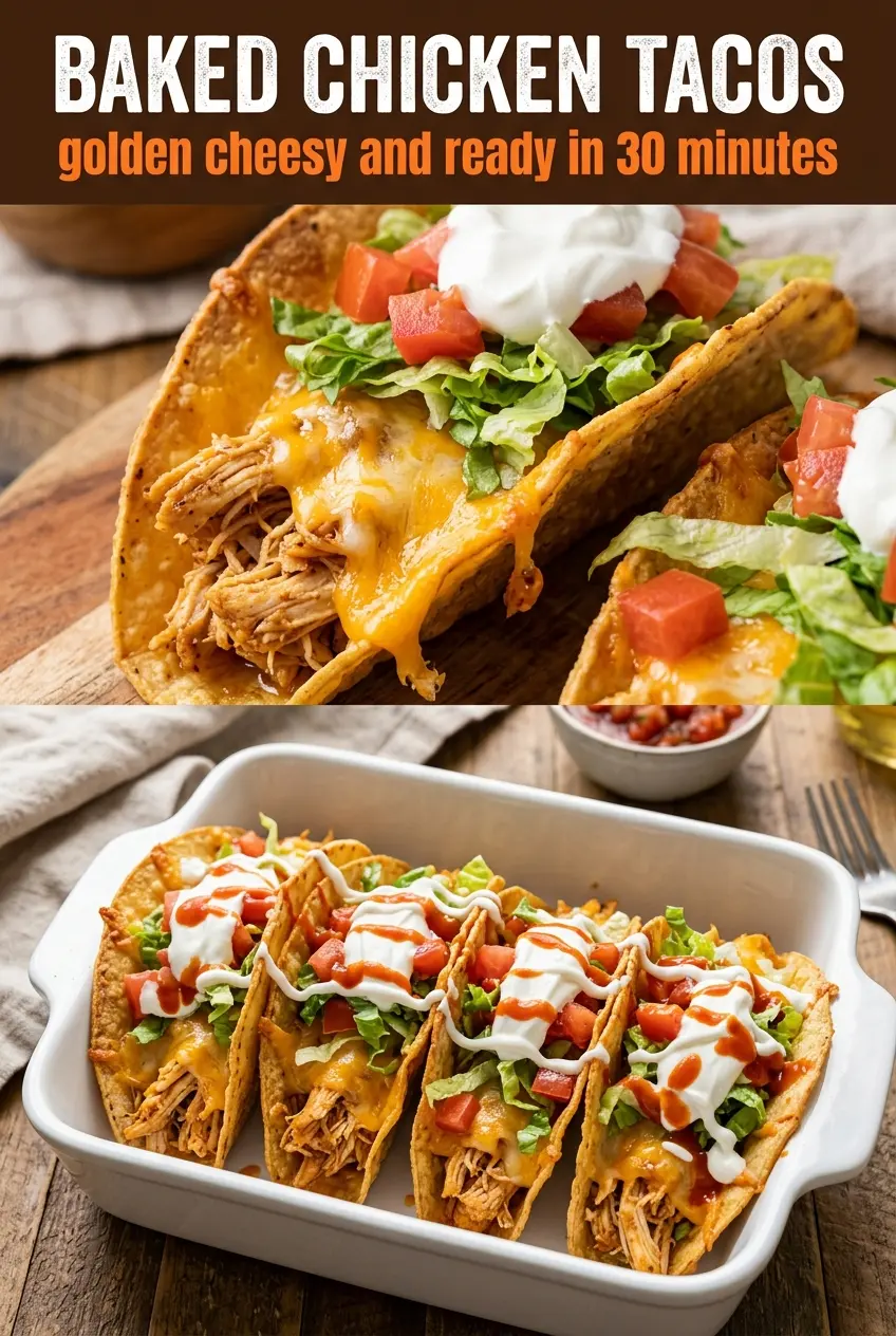 Crispy baked chicken tacos with shredded chicken, golden corn shells, and fresh toppings are perfect for a fast dinner that still feels fun.