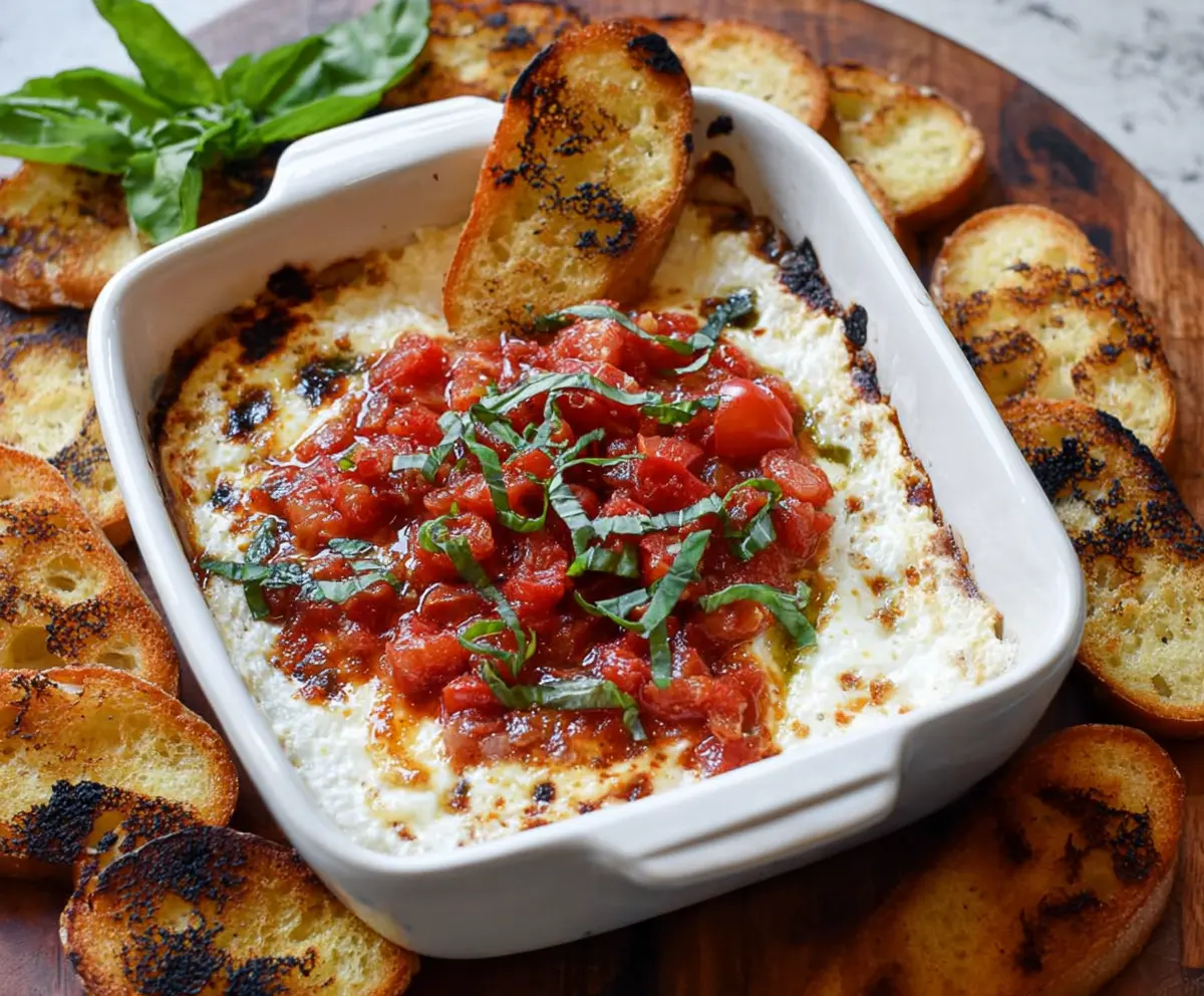When it’s done baking, carefully remove it from the oven. Sprinkle sliced fresh basil on top for that fresh kick. Serve it warm with your toasted baguette or crusty bread slices for dipping. Enjoy every delicious bite!