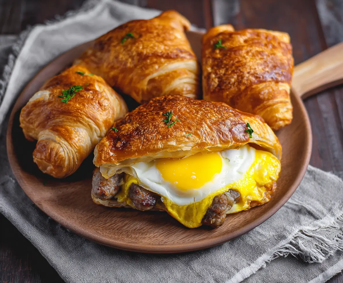 This recipe yields a deliciously flaky croissant filled with savory sausage, creamy melted cheese, and a rich, runny egg yolk that makes for an unforgettable brunch experience. Enjoy every bite!