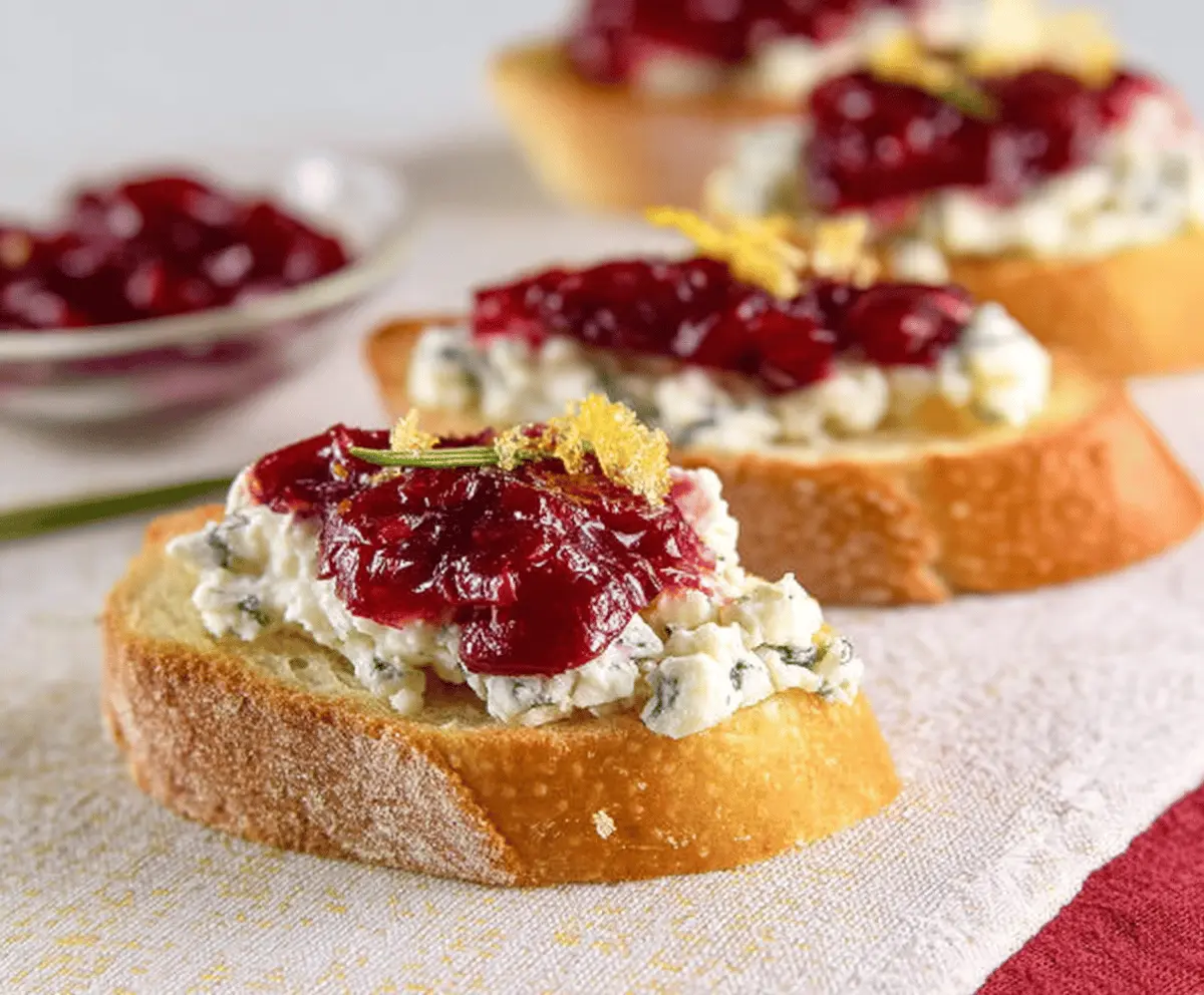 This dish combines the rich, tangy blue cheese with sweet and tart cranberries on crispy bread, creating a delicious bite-sized treat! Enjoy your culinary creation!