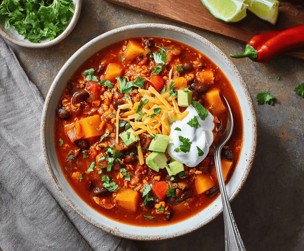A bowl of hearty butternut squash chili garnished with fresh herbs, featuring chunks of squash, beans, and spices in a flavorful, comforting dish.