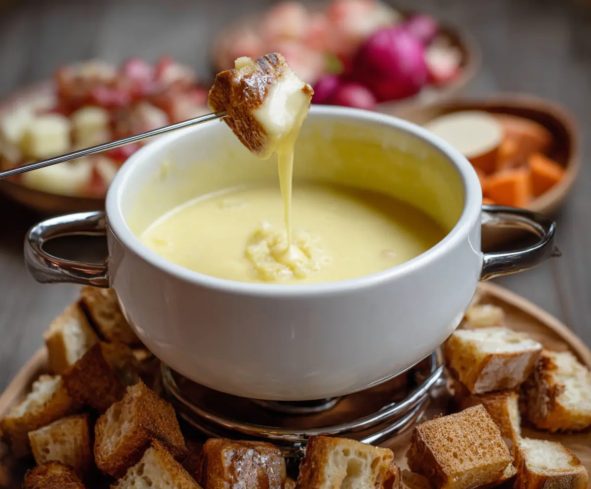 Keep the fondue warm over a low flame or a fondue burner to maintain that gooey texture. Serve it up with cubes of crusty bread and any optional dippers you’ve prepared. Use fondue forks to dip the bread or veggies into the cheese and enjoy the melty goodness!