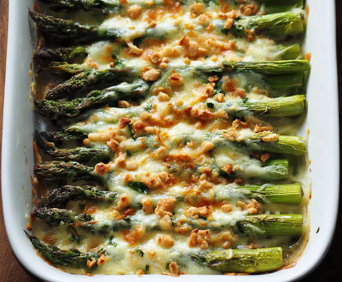 Pop the baking dish into your preheated oven and let it bake for 15-20 minutes. Keep an eye out! You’re looking for tender asparagus and beautifully melted, golden cheese.