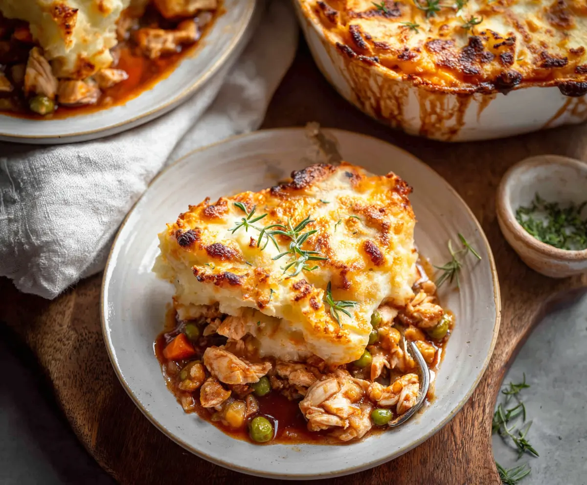 Once it’s ready, remove the dish from the oven and let it cool for a minute. Garnish with fresh or dried thyme for a lovely touch. Serve warm and enjoy your delicious Chicken Shepherd’s Pie!