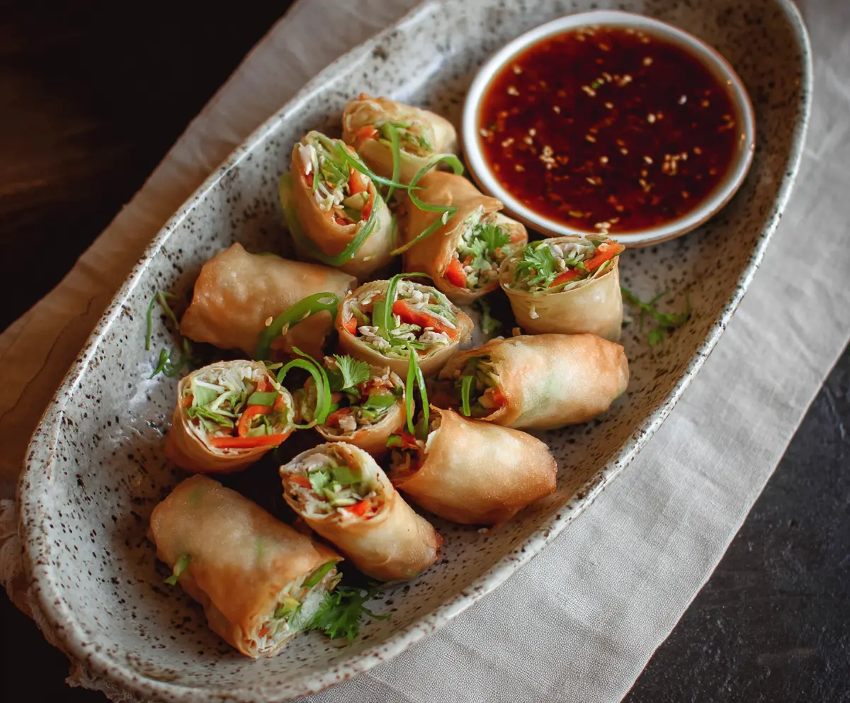 Once the spring rolls are crispy, take them out and let them drain on paper towels to remove any excess oil. For the dipping sauce, mix together the hoisin sauce, soy sauce, rice vinegar, chili sauce, minced garlic, and any fresh herbs you choose in a small bowl until well combined.