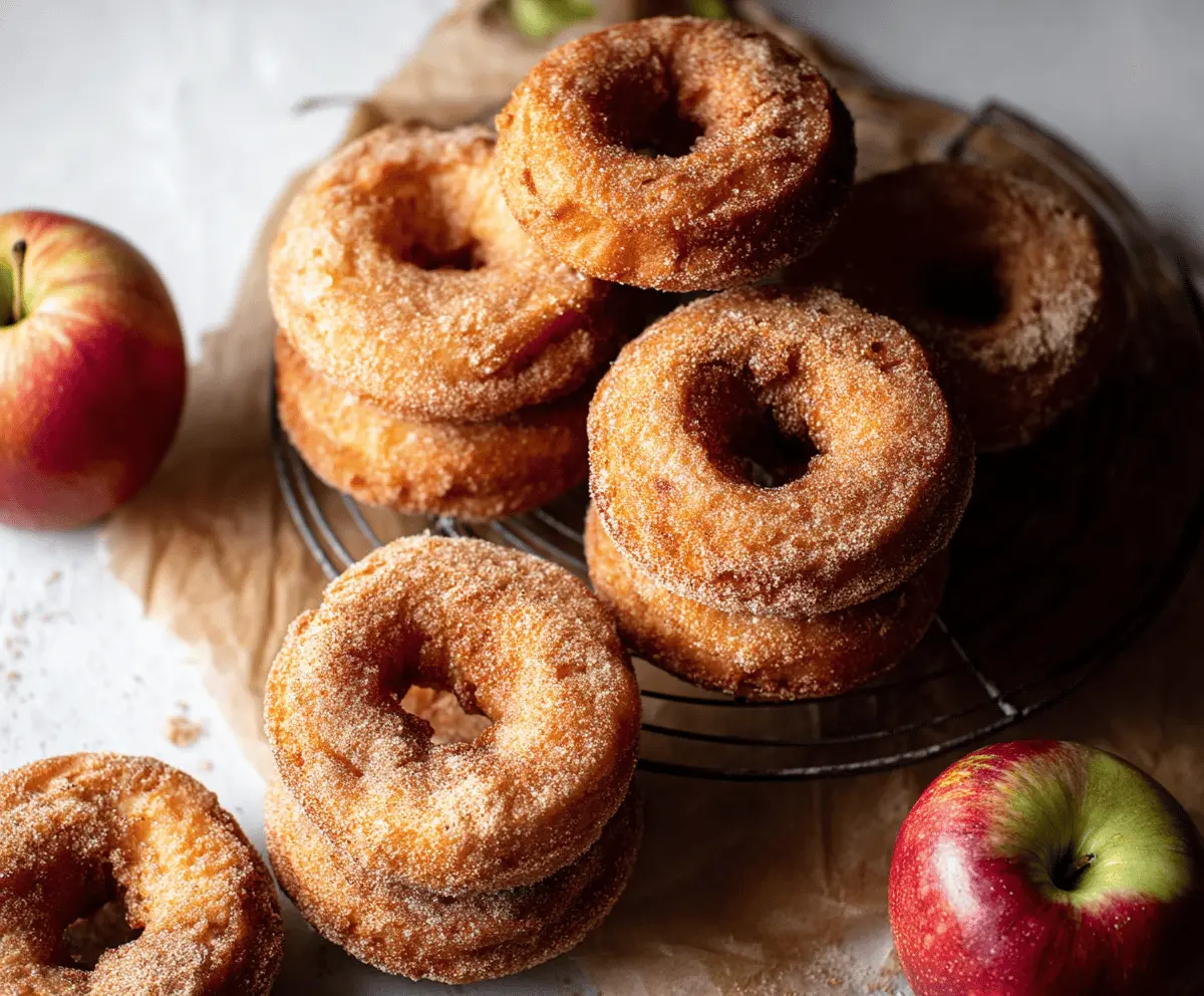 Delicious cinnamon apple donuts glazed with cinnamon sugar, perfect for breakfast or snacking.