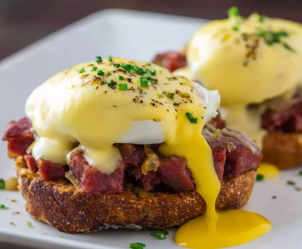 Corned Beef Hash Eggs Benedict is a tasty twist on the classic breakfast. It features crispy corned beef hash topped with a poached egg and creamy hollandaise sauce.