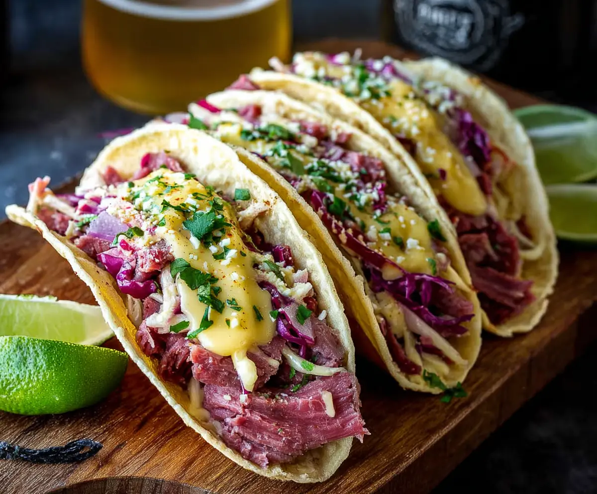 Enjoy your flavorful Corned Beef Tacos with a tangy and creamy twist!