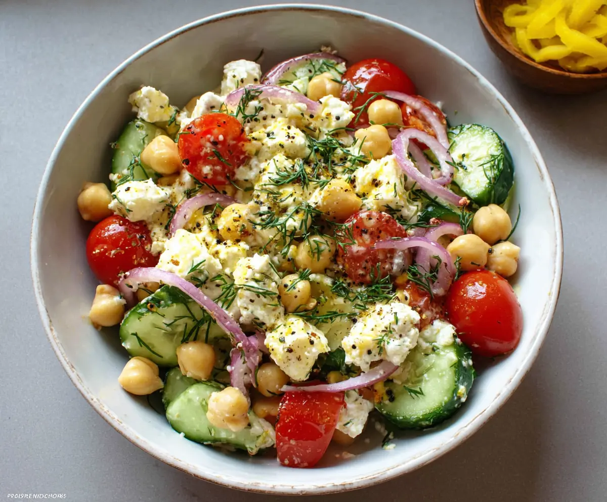 This Cottage Cheese and Chickpea Salad is a refreshing dish packed with protein and flavor. The creamy cottage cheese pairs perfectly with the hearty chickpeas and vibrant veggies.