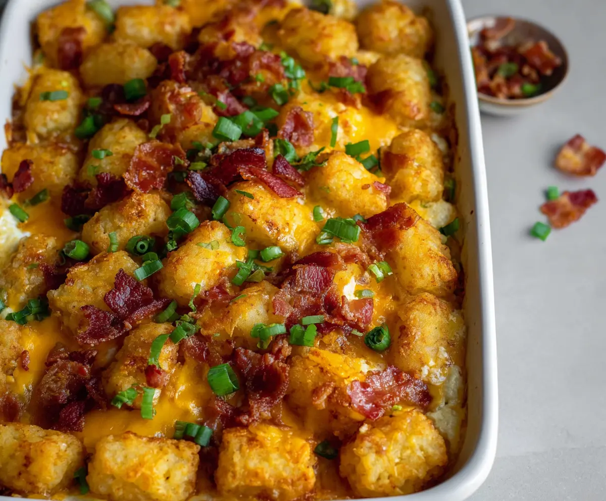 Enjoy a hearty, cheesy, loaded breakfast casserole with crispy tater tots, savory sausage, eggs, bacon, and fresh green onions!