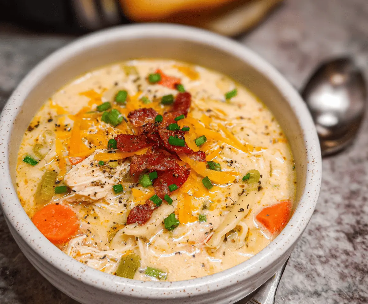 This soup combines creamy, cheesy, and savory flavors with hearty noodles and tender chicken—perfect comfort food with a “crack chicken” twist!