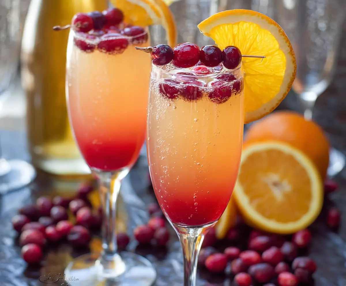 Refreshingly vibrant cranberry orange mimosa in a elegant glass, garnished with fresh cranberries and orange slices.