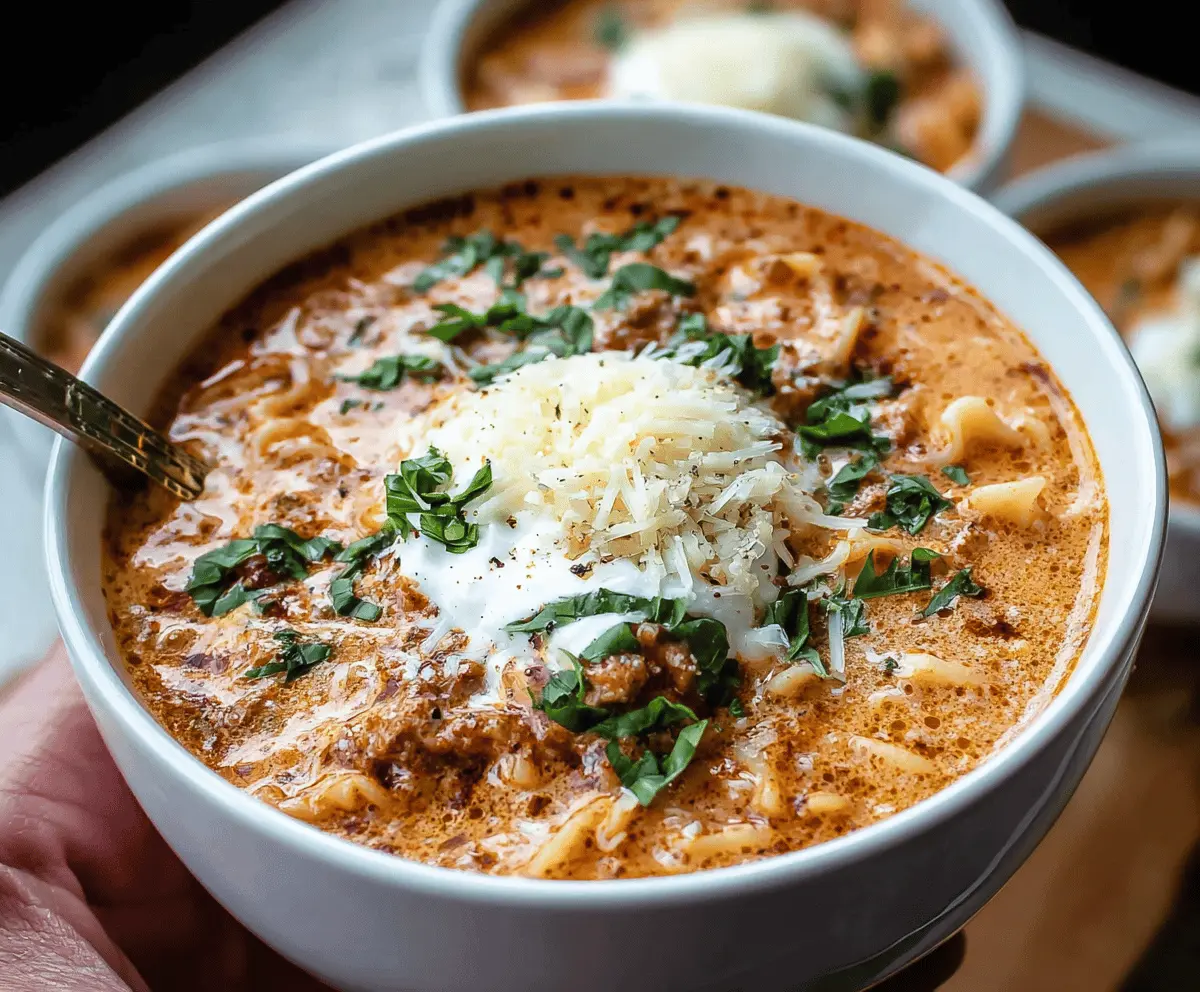 Creamy Instant Pot Lasagna Soup in a bowl topped with melted cheese and fresh herbs, ready to serve