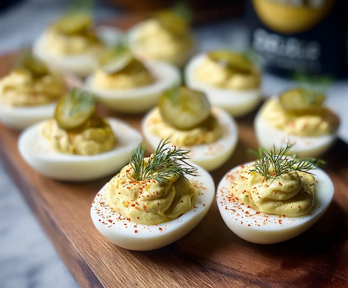 Dill pickle deviled eggs are a fun twist on a classic appetizer. Creamy yolk mixture meets tangy dill pickles for a tasty bite that’s hard to resist!