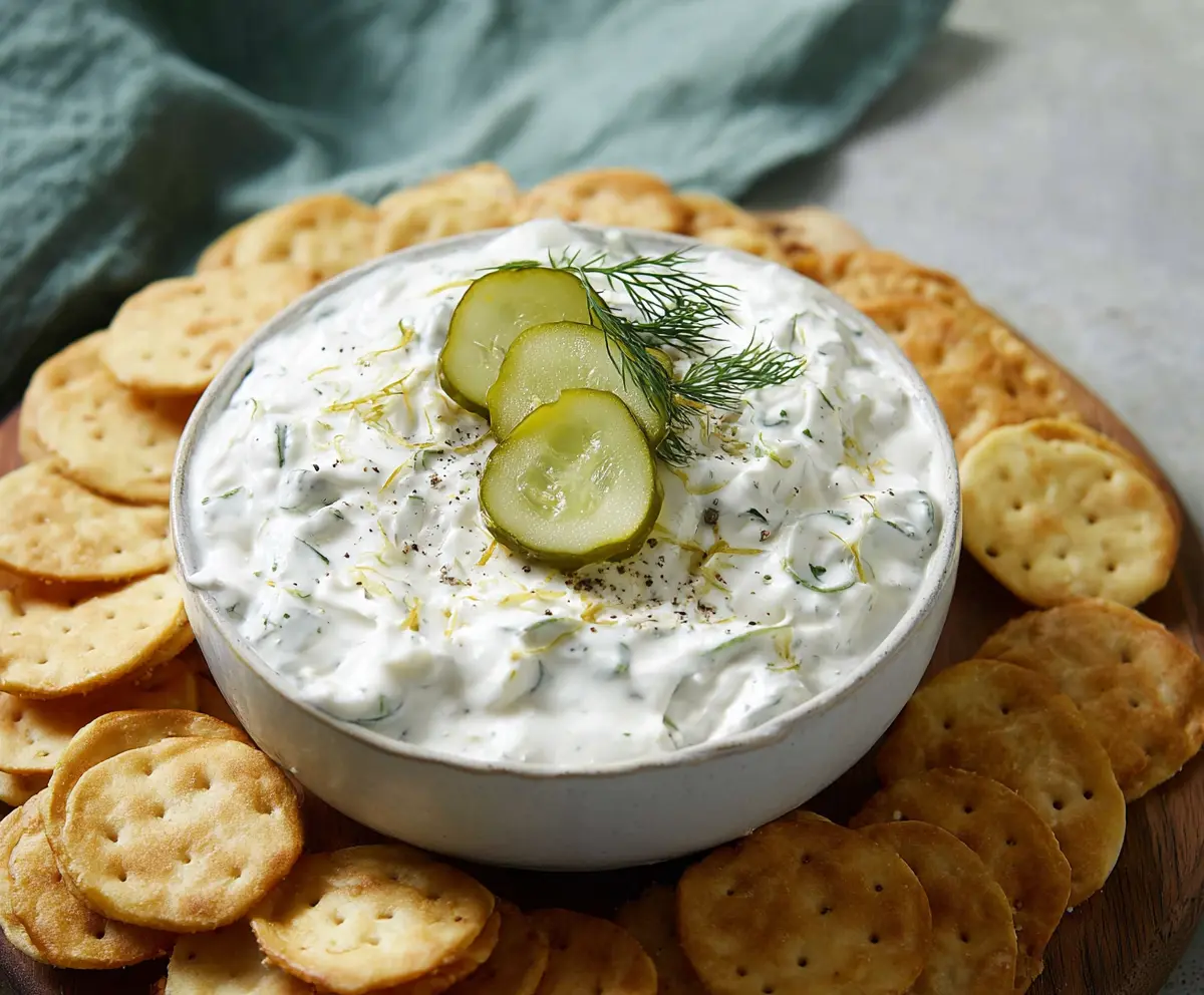 Creamy dill pickle dip served with fresh vegetables for a refreshing appetizer.