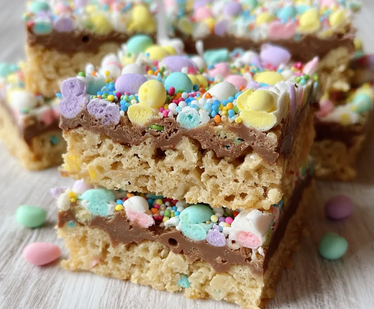 These Easter Goody Bars are a fun and colorful treat! They are packed with crispy rice cereal, marshmallows, and a sprinkle of festive candies. Perfect for sharing during the holiday!