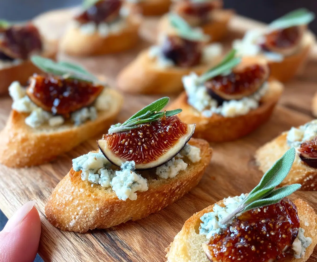 Fig and blue cheese crostini are a tasty treat! These crunchy toast bites are topped with sweet figs and creamy blue cheese, making them a perfect snack for any gathering.