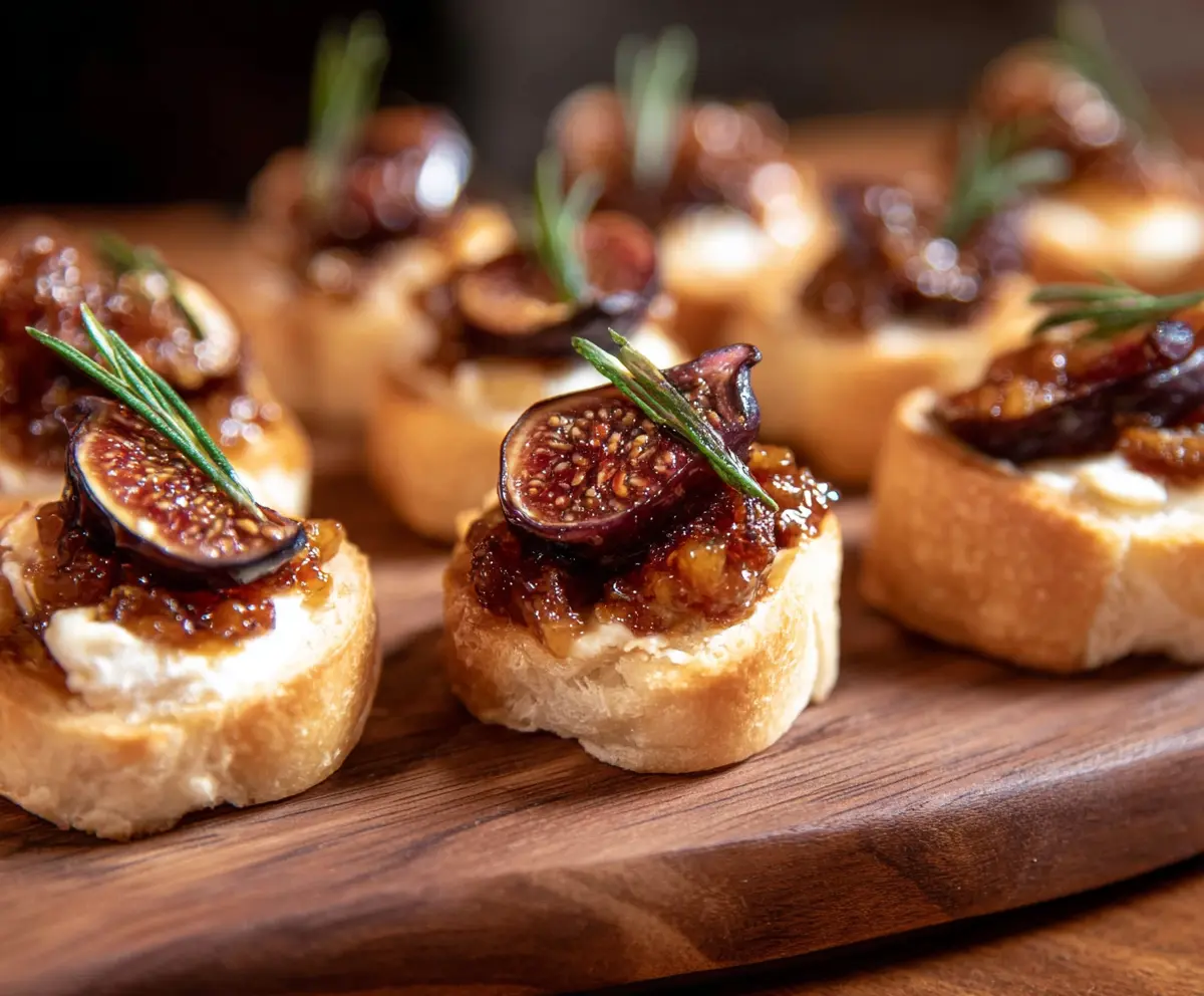 Finally, add a small sprig of fresh rosemary on top of each Fig Brie Bite for a pop of color and an aromatic touch.