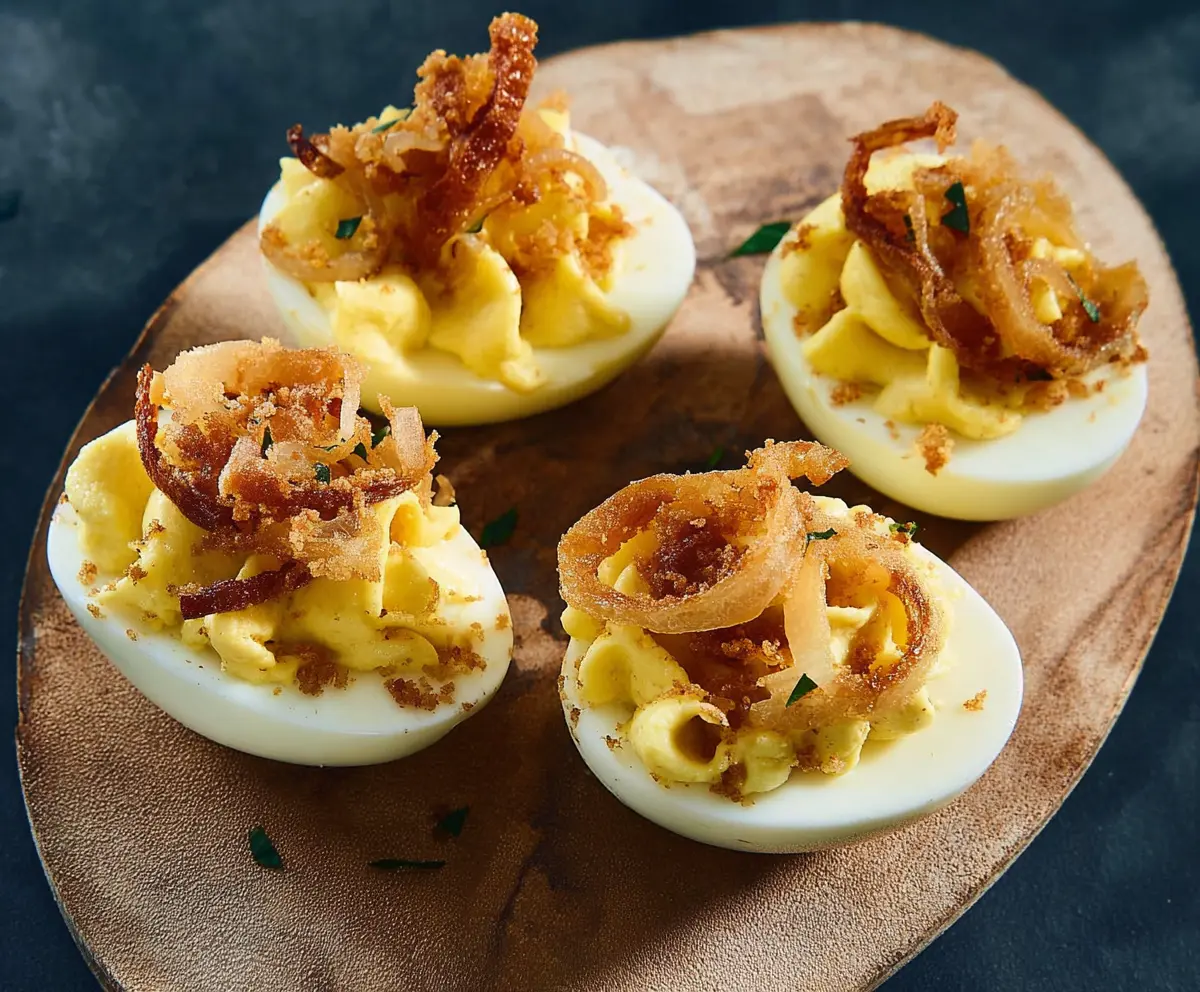 French Onion Deviled Eggs are a tasty twist on a classic snack! They mix creamy egg yolks with the delicious flavors of French onion soup, topped with crispy onions for crunch.