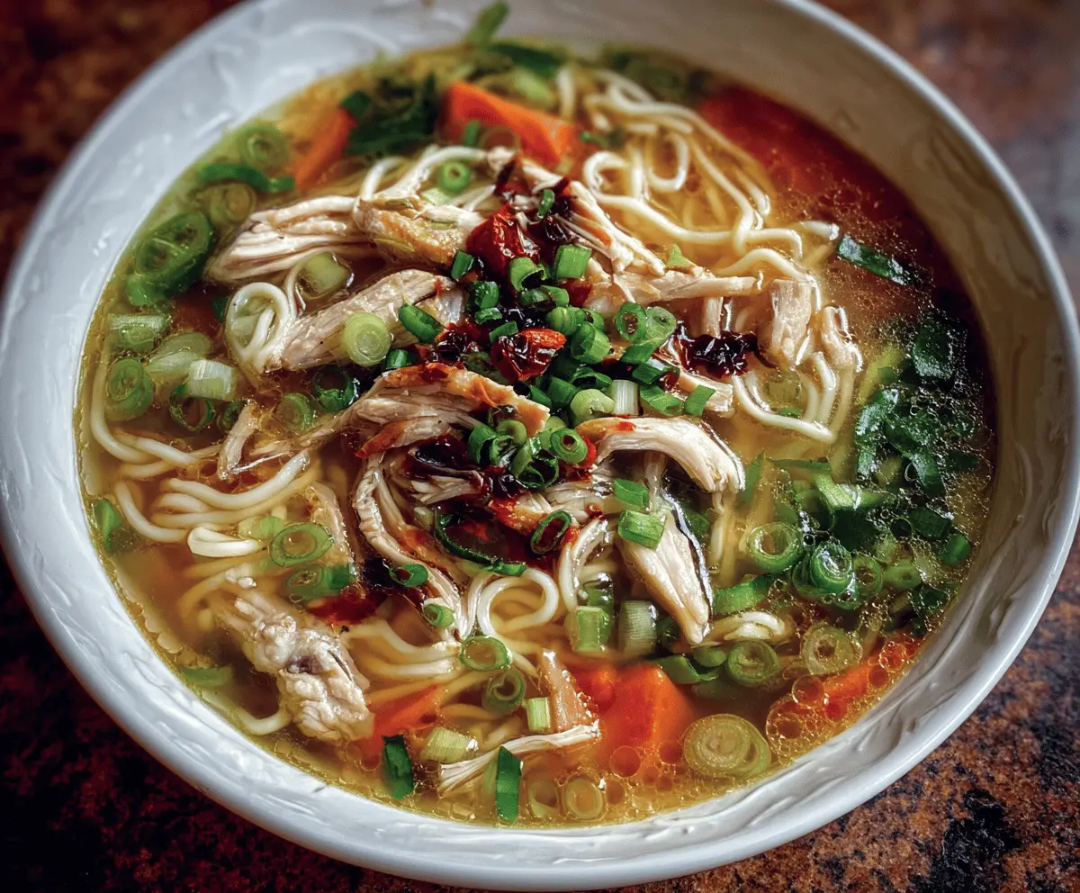 This soup combines the savory taste of chicken broth with the bold flavors of garlic and ginger, along with tender chicken and slurpy noodles. It’s not just a meal; it’s a warm embrace on a chilly day. Enjoy every comforting spoonful!