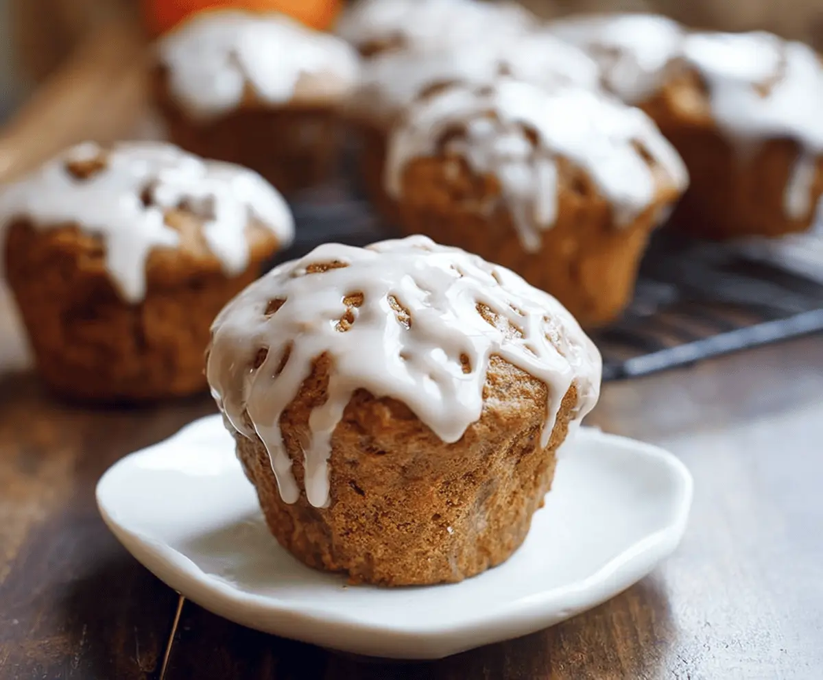 Delicious glazed pumpkin muffins topped with a shiny glaze and cinnamon, perfect for fall breakfast or snack