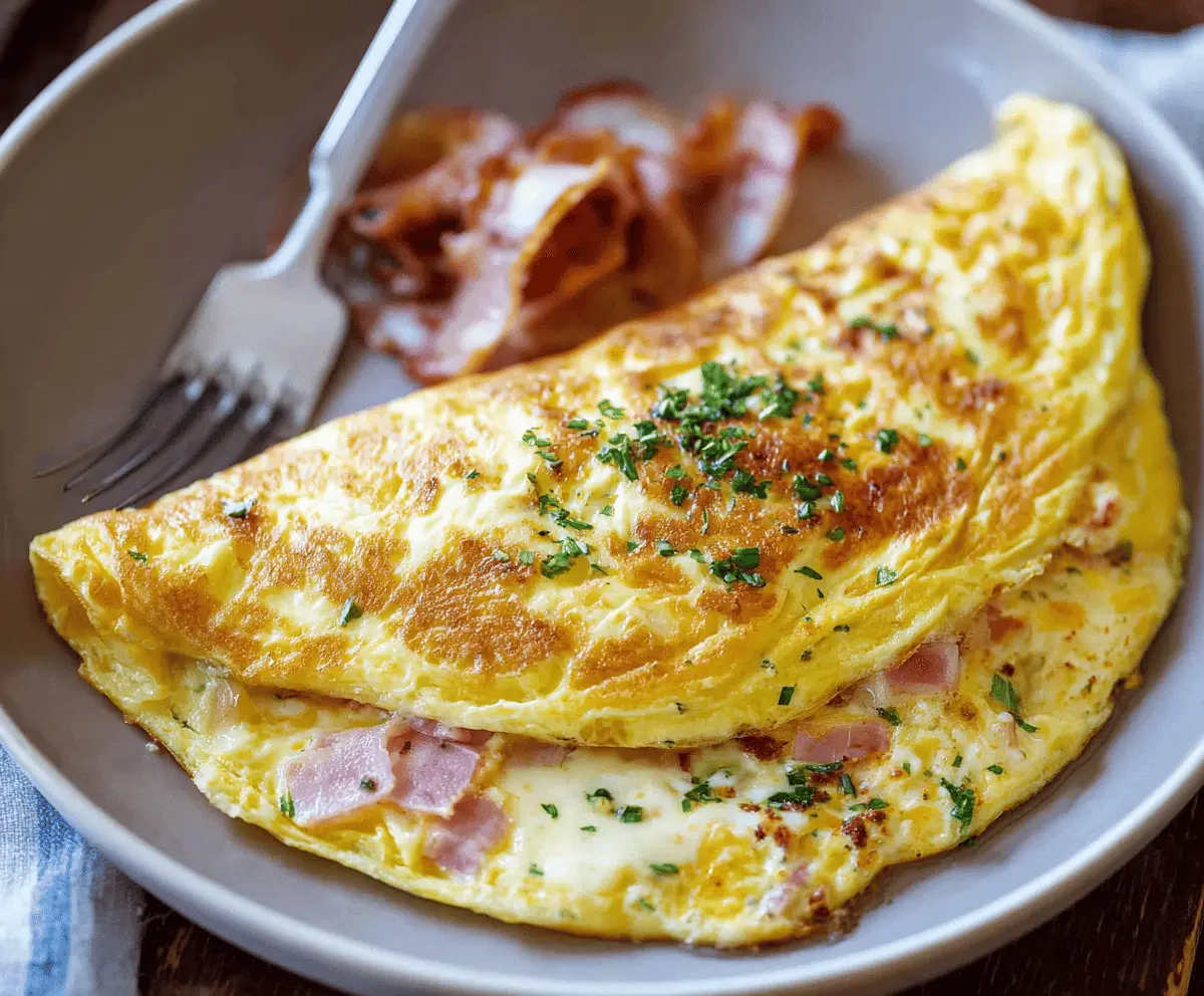 Gently slide the omelet onto a plate. If you’d like, sprinkle some fresh chopped chives or parsley on top for a bit of color and flavor. Serve immediately and enjoy your delicious ham and cheese omelet!