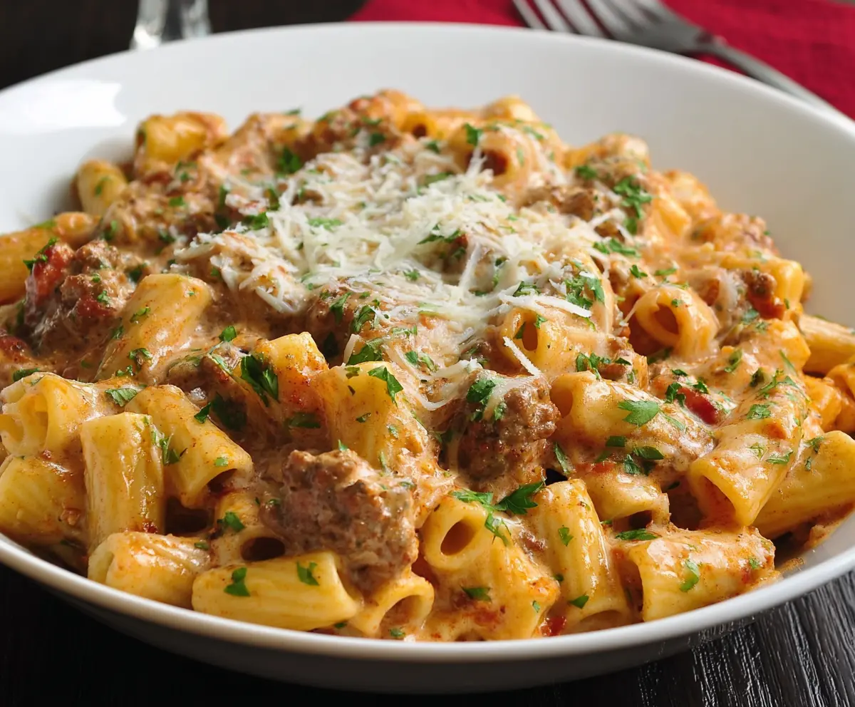 Give the pasta a taste and adjust the seasoning with salt and pepper as needed. When you’re ready to serve, dish out the pasta and garnish with freshly chopped parsley and extra Parmesan cheese on top. Enjoy every bite of your rich and creamy sausage pasta!
