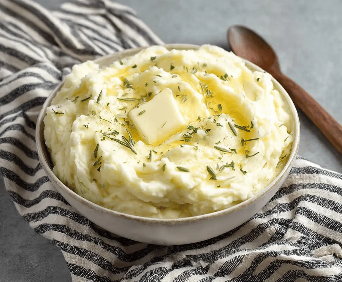 Season the mashed potatoes with salt and freshly ground black pepper to taste. Transfer them to a serving bowl, and if desired, top with a couple of pats of butter and sprinkle with fresh thyme or parsley for a lovely touch.