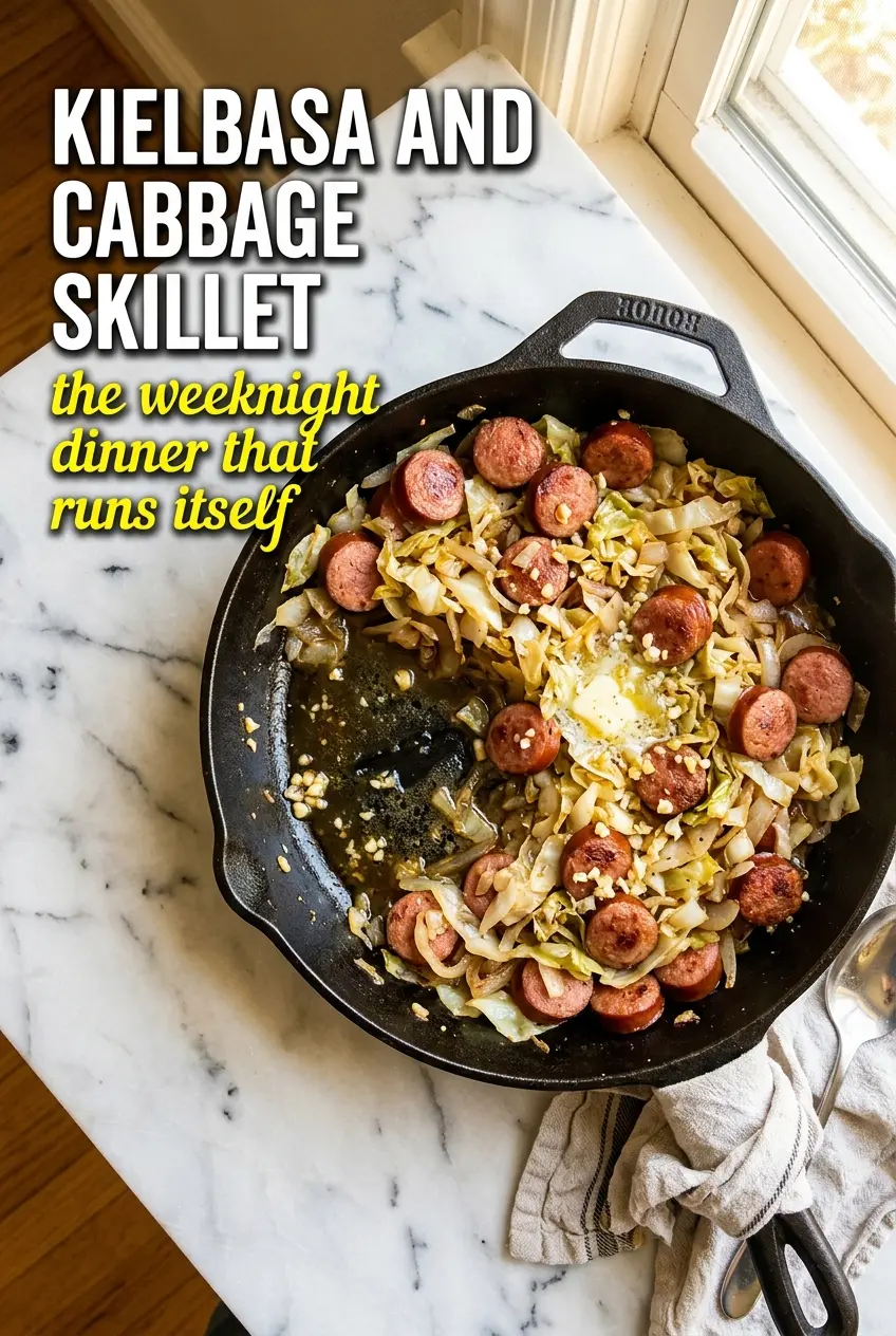 Save this kielbasa and cabbage skillet for a fast one-pan dinner with browned sausage, tender cabbage, and caraway.