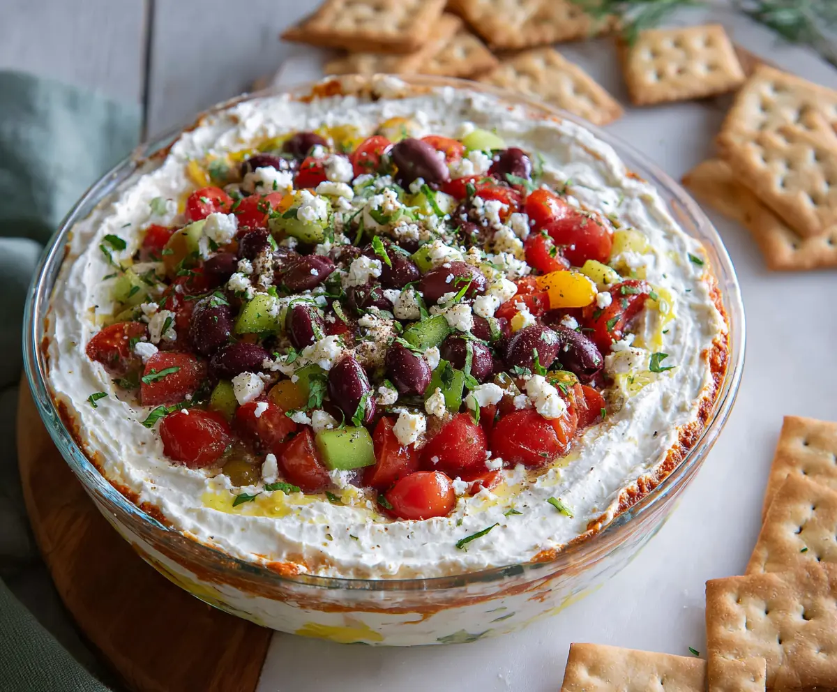 This Layered Greek Dip is a colorful and tasty treat! Packed with creamy yogurt, fresh veggies, and zesty olives, it’s perfect for sharing at parties.