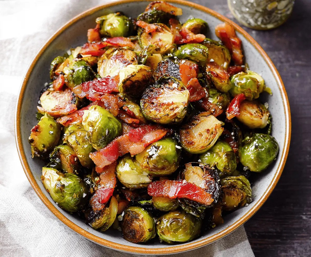 Once the Brussels sprouts are perfectly roasted, transfer them to a serving bowl. Drizzle the maple balsamic mixture over the hot sprouts and toss them gently to coat. Add in your crispy bacon pieces and give it a final mix.