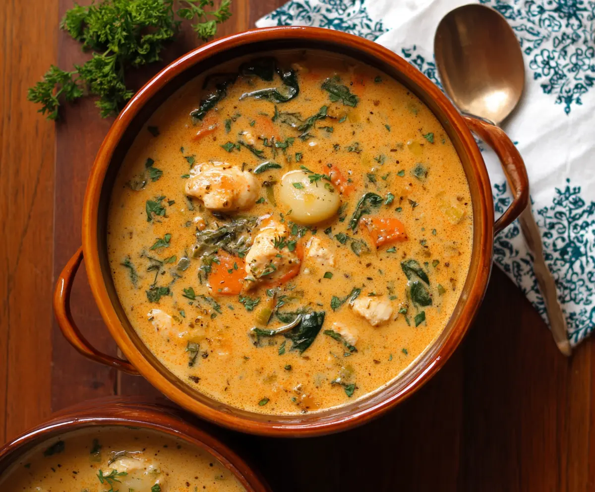 Creamy Tuscan Chicken Gnocchi Soup with fresh herbs and tender chicken pieces in a savory broth.