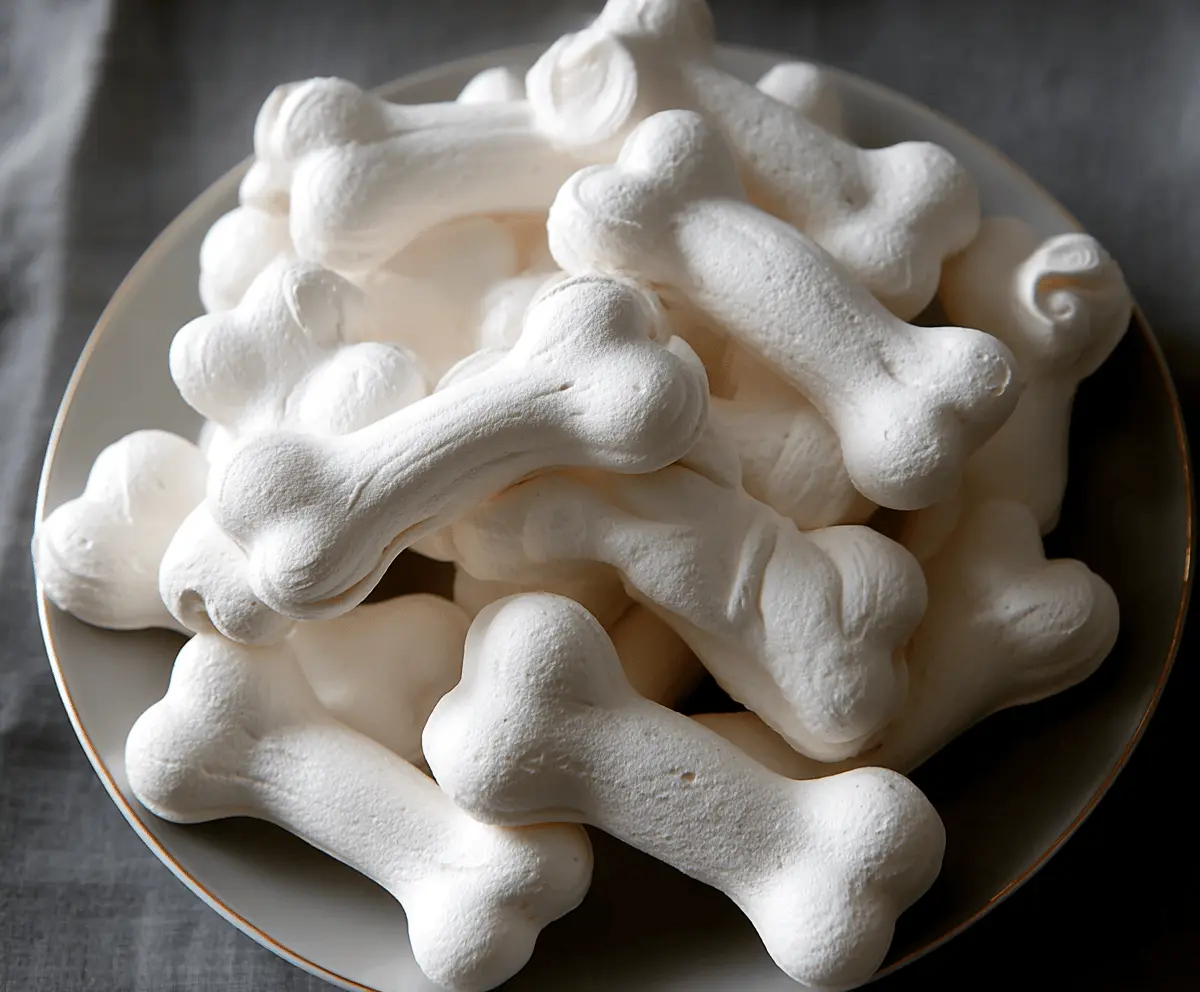 Decorative Meringue Bone Cookies, spooky Halloween treats with crisp, white bone-shaped meringues on a festive platter