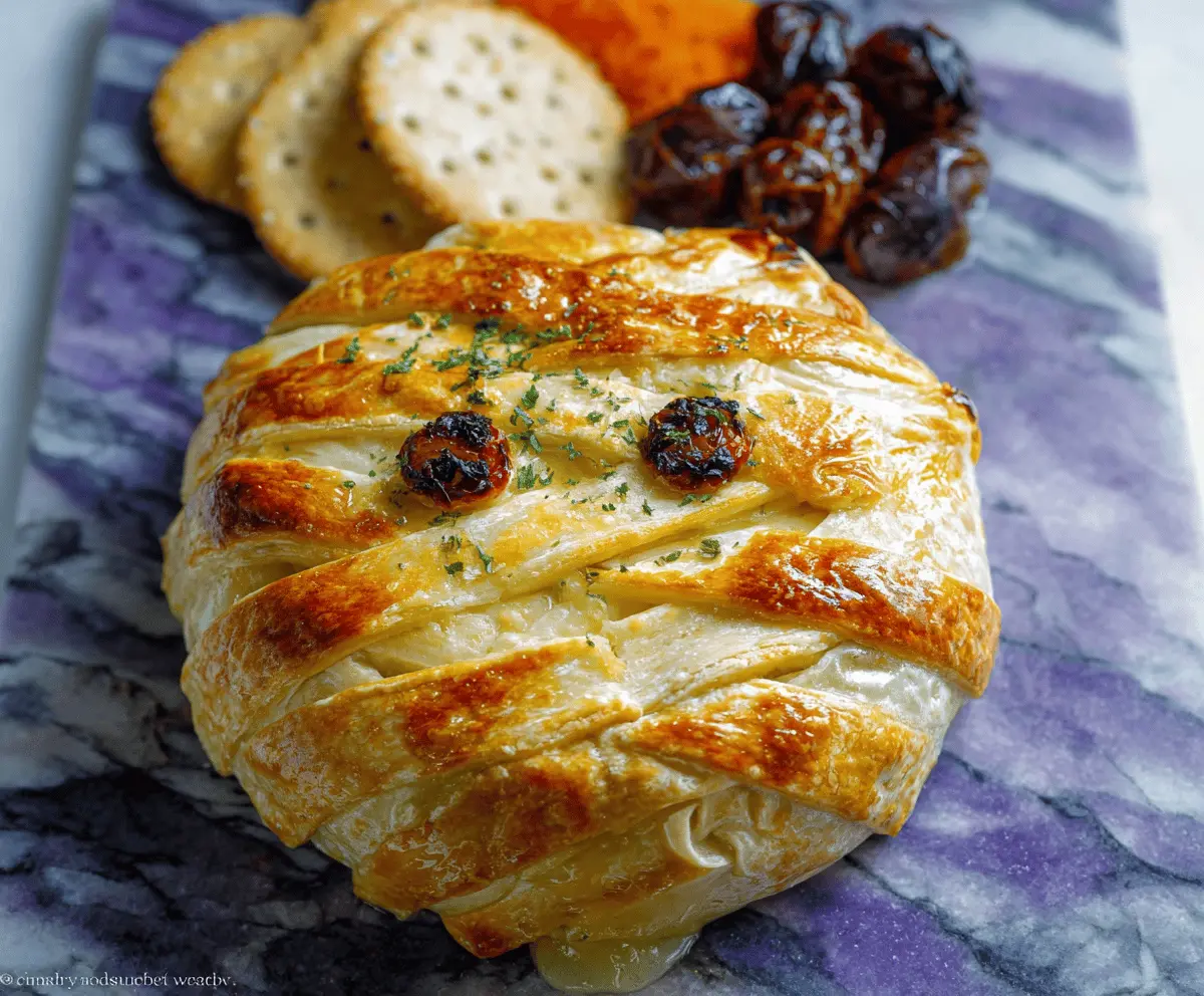 Delicious Mummy Baked Brie topped with spooky puff pastry bandages for a Halloween appetizer display.