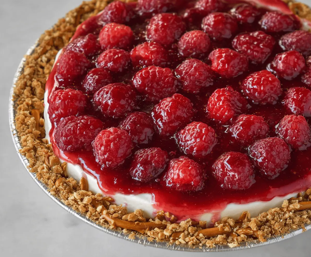 Delicious No-Bake Raspberry Pretzel Pie with fresh raspberries and crunchy pretzel crust.