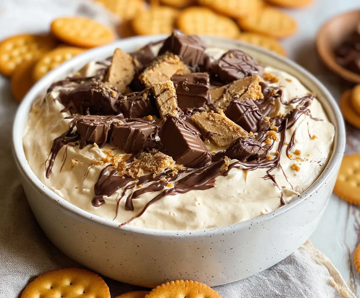 Transfer the creamy dip into a serving bowl and smooth the top with a spatula. Drizzle the melted chocolate over the dip to make it look extra appealing. Then, sprinkle with those yummy chocolate peanut butter candy pieces or chopped peanut butter cups.