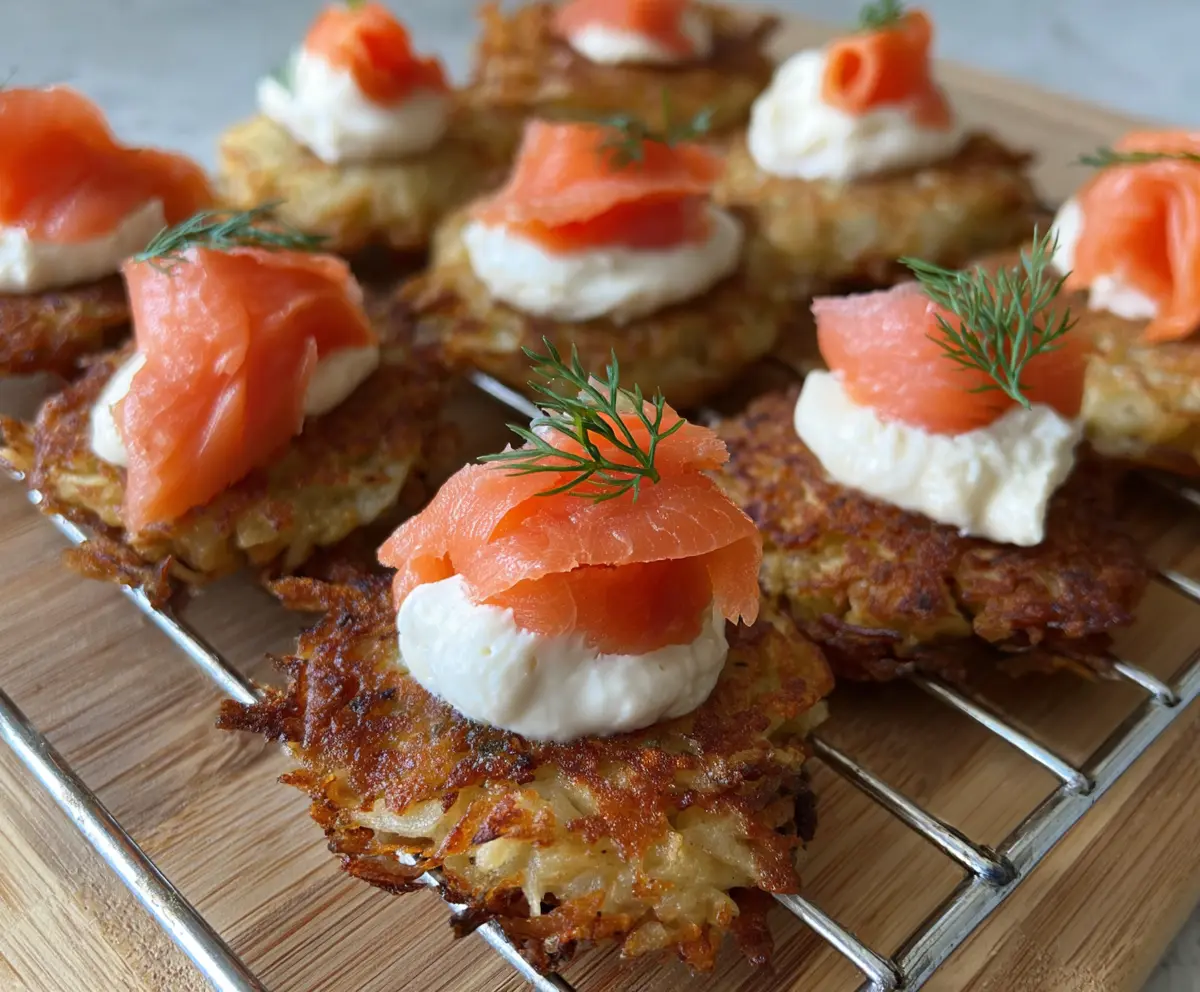 These crispy potato latke bites are a tasty twist on a classic! Topped with rich smoked salmon, they make for a delightful treat at any gathering.