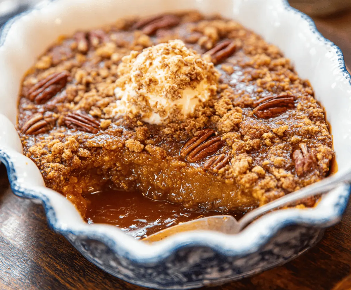 Serve warm, ideally with a generous scoop of vanilla ice cream on top. Enjoy the rich flavors of pumpkin, warm spices, and crunchy pecans—perfect for those cozy autumn evenings!