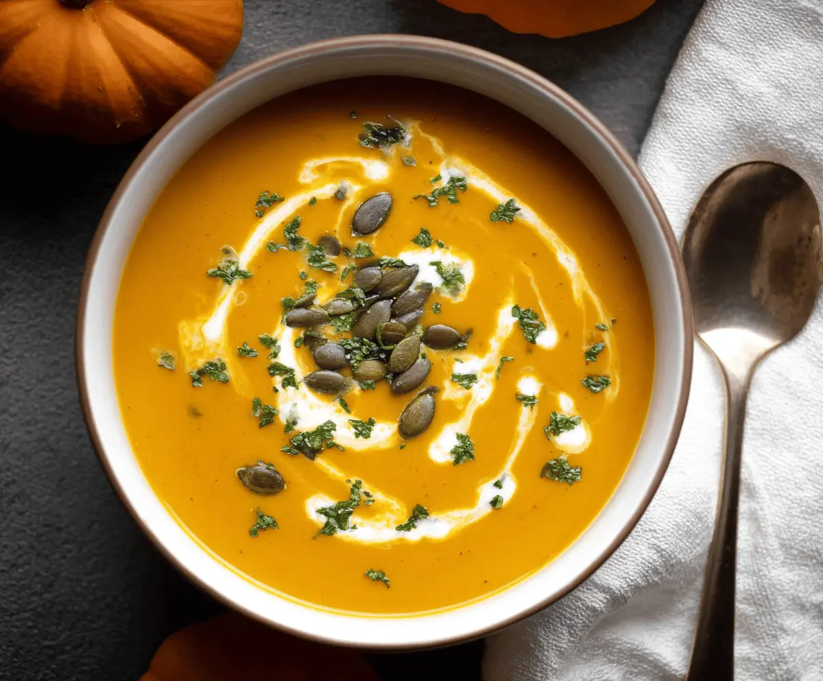 Creamy pumpkin soup garnished with fresh herbs in a rustic bowl, perfect for fall comfort food