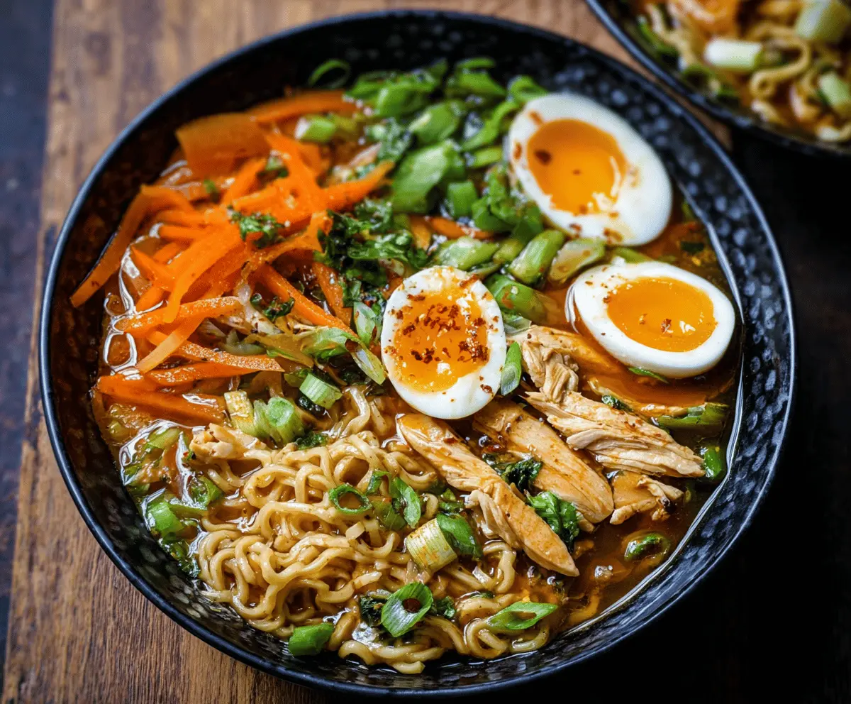 Divide the soup into bowls. Top each bowl with halved soft-boiled eggs, sliced green onions, and a drizzle of chili oil or a sprinkle of chili flakes for that perfect kick. Serve hot with chopsticks and a spoon. Enjoy every comforting spoonful of this delicious ramen chicken noodle soup!