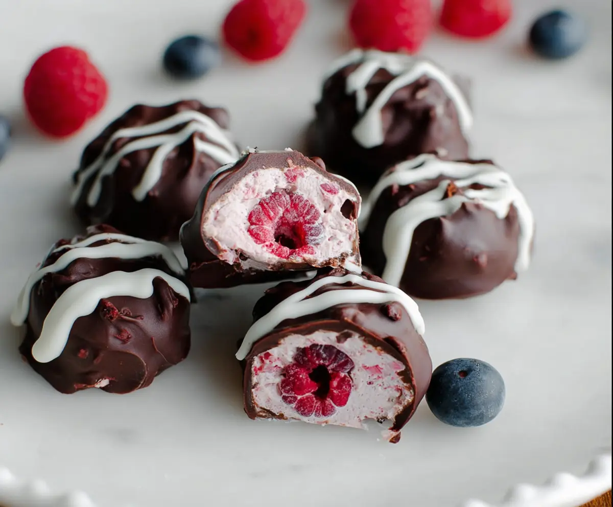 These delightful bites combine a creamy yogurt center with bursts of tart raspberries and a rich dark chocolate shell, perfect for satisfying any sweet tooth.