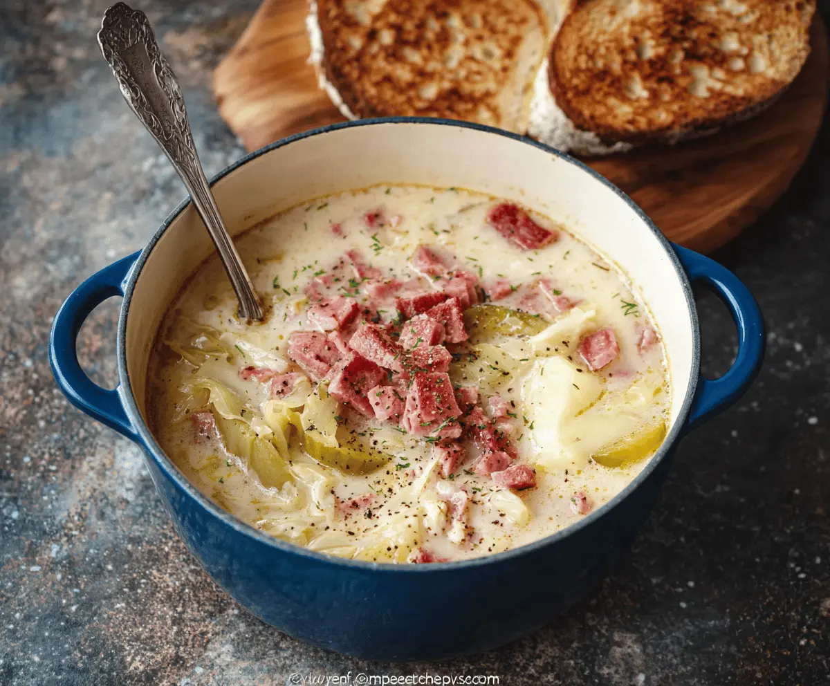 Reuben Soup is a cozy twist on the classic sandwich! It mixes tasty corned beef, creamy cheese, and tangy sauerkraut, all in a warm bowl of goodness.