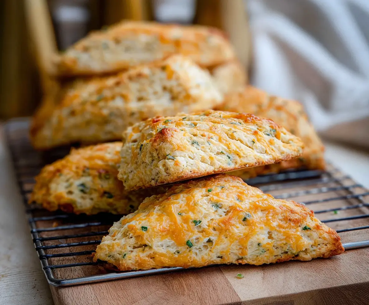 Golden sourdough scones with sharp cheddar and fresh chives on a rustic wooden table.