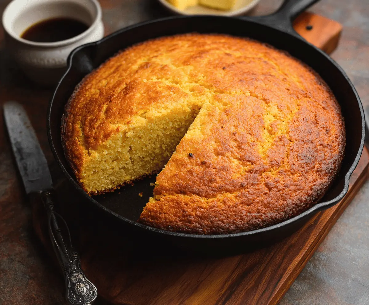 This skillet cornbread features a crispy crust and a soft, buttery inside—a delightful addition to any meal or a cozy snack on its own!